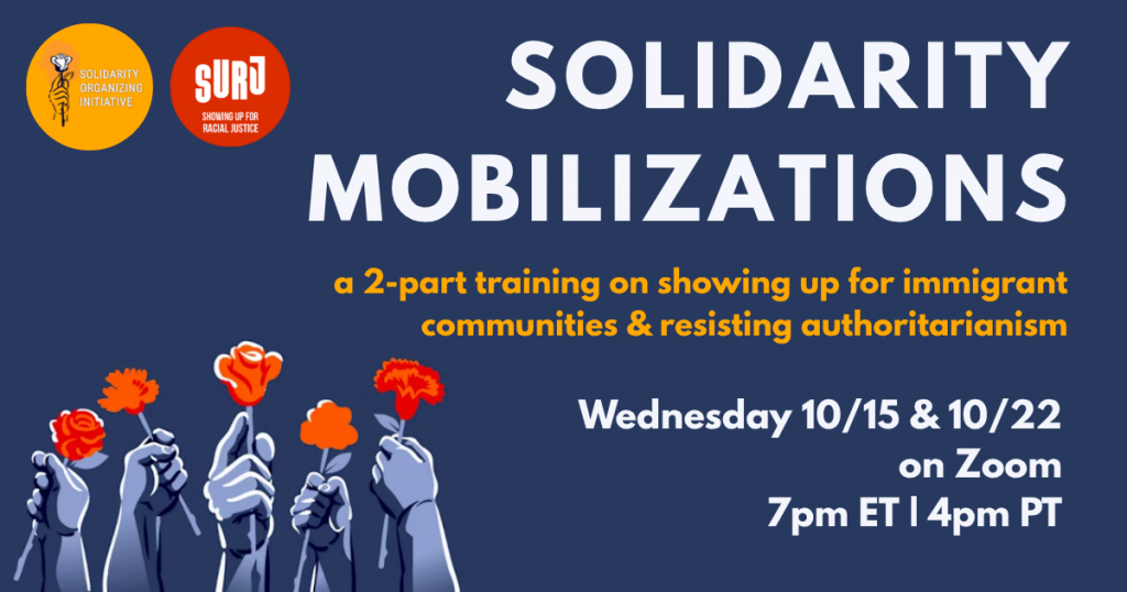Now is your chance to join us. Will you join the 2-part Solidarity Mobilizations training program on Wednesday, October 15th & October 22nd alongside thousands of other SURJ members ready to stand with our immigrant neighbors?