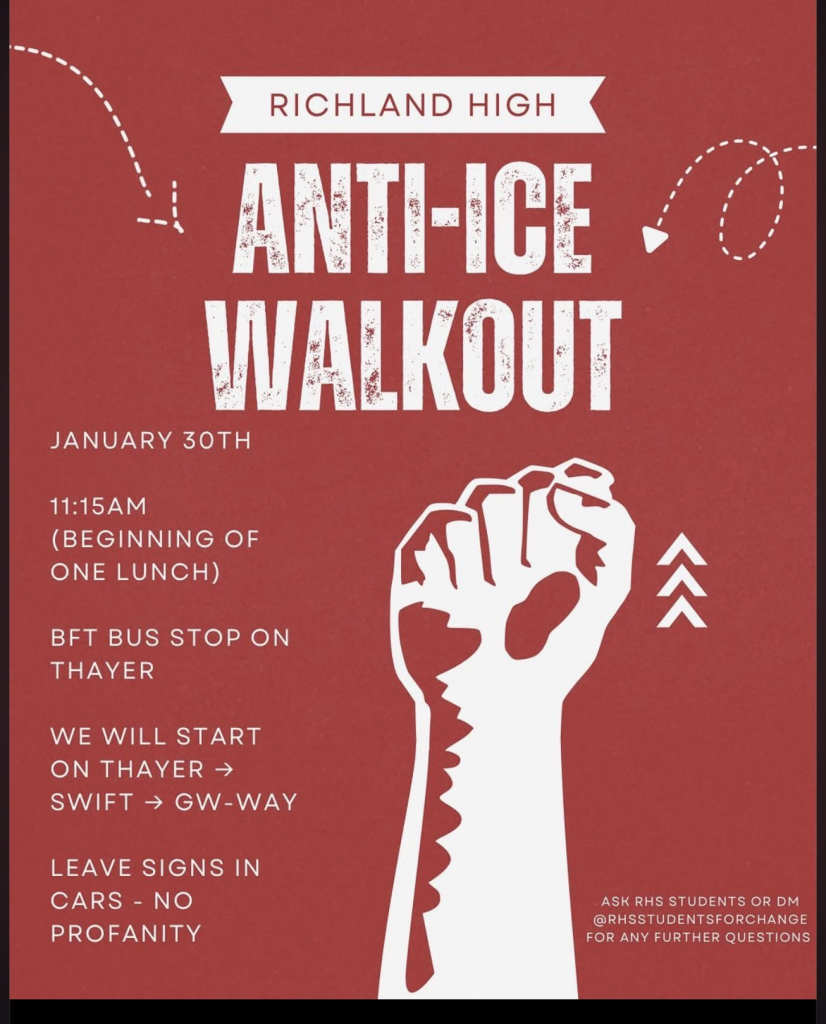 RHS Students for Change are having an Anti-Ice Walkout on January 30 at 11:15. They will gather at the BFT bus stop on Thayer. They will go rmo Thayer to Swift to GW Way. They request that there be no sighns and no profanity.