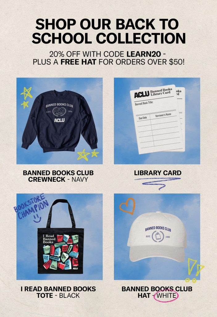 And right now, when you check out with code LEARN20, we’ll give you 20% off any of our back to school collection – plus a free white Banned Books Club hat with any purchase over $50!