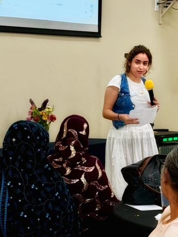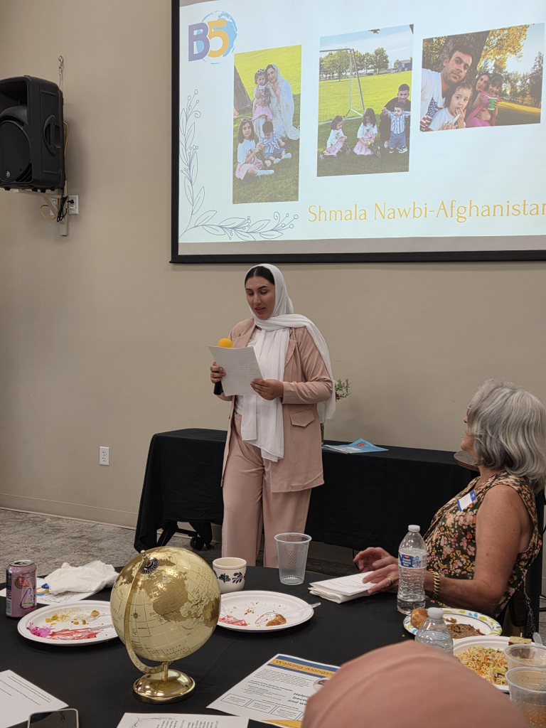 Zaina Ibrahim, Women and Family Support at B5, shared Mahboba’s story. Mahboba has been persistent in her studies, even while caring for her family of eight children. She and her husband and their children were evacuated from Afghanistan by the US military when the US withdrew. Mahboba looks forward to the independence learning English and getting her driver’s license will give her. She wants to use her skills in sewing and jewelry-making as well.