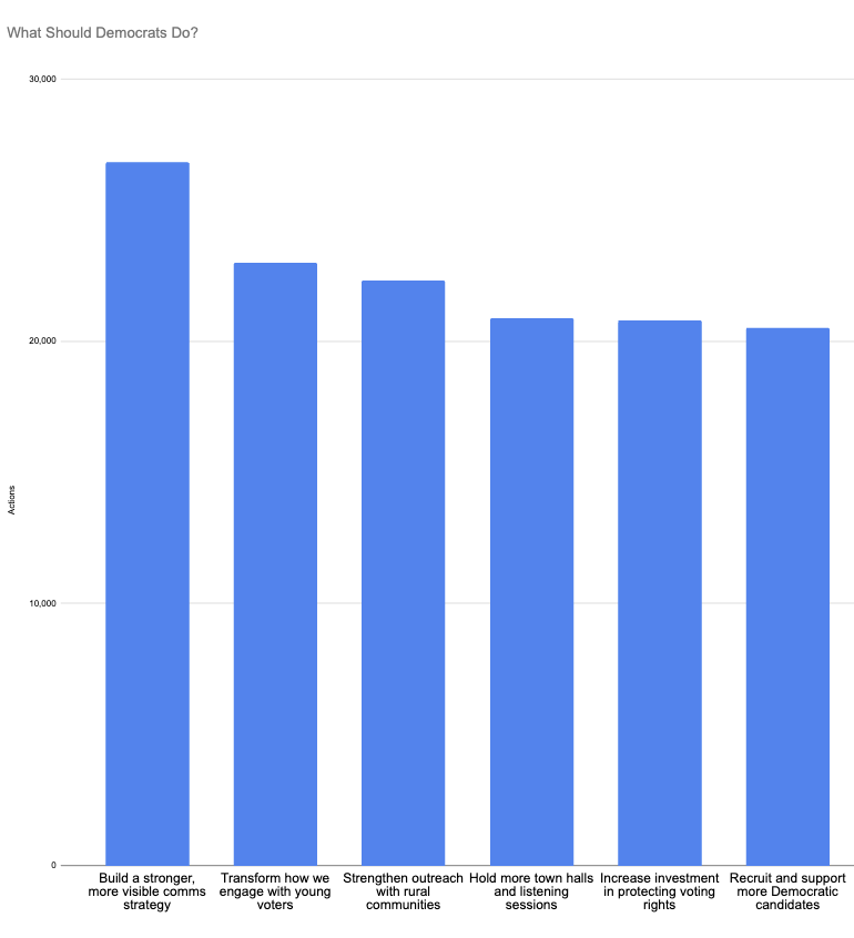 At the same time, supporters want to be heard, and more than 20,000 survey respondents said they would like to see Democrats host more town halls and listening sessions where Party leaders can hear from voters directly.