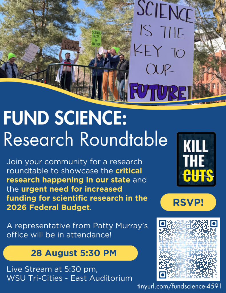 Help stop cuts to Publicly Funded Research! UAW 4591 is holding a Research Roundtable with staff from Sen. Murray’s and Rep. Baumgartner’s offices on Thur, Aug 28th at 5:30 pm. The event will showcase the critical research that drives progress and economic growth in Tri-Cities and beyond–and make the case for robust federal funding for scientific research in the 2026 federal budget. Join with researchers in the Tri-Cities area for a participatory live-stream of the event in the WSU East Auditorium (enter the campus via the entrance on Sprout Rd; the East building will be on your right, closest to the river).