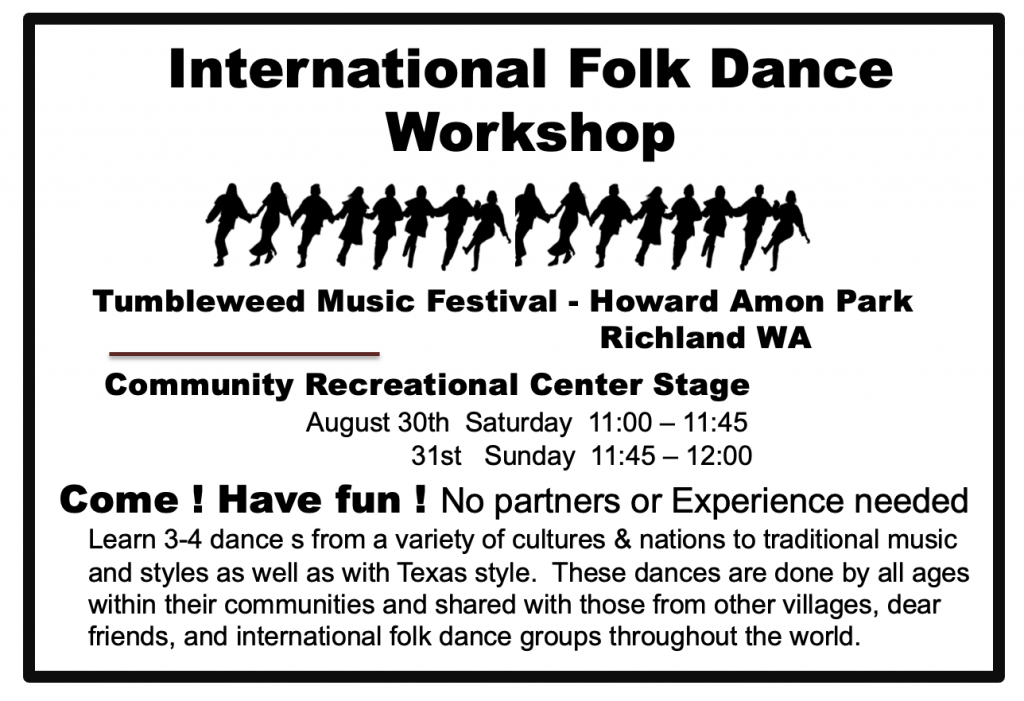 Come ! Have fun ! No partners or Experience needed Learn 3-4 dance s from a variety of cultures & nations to traditional music and styles as well as with Texas style. These dances are done by all ages within their communities and shared with those from other villages, dear friends, and international folk dance groups throughout the