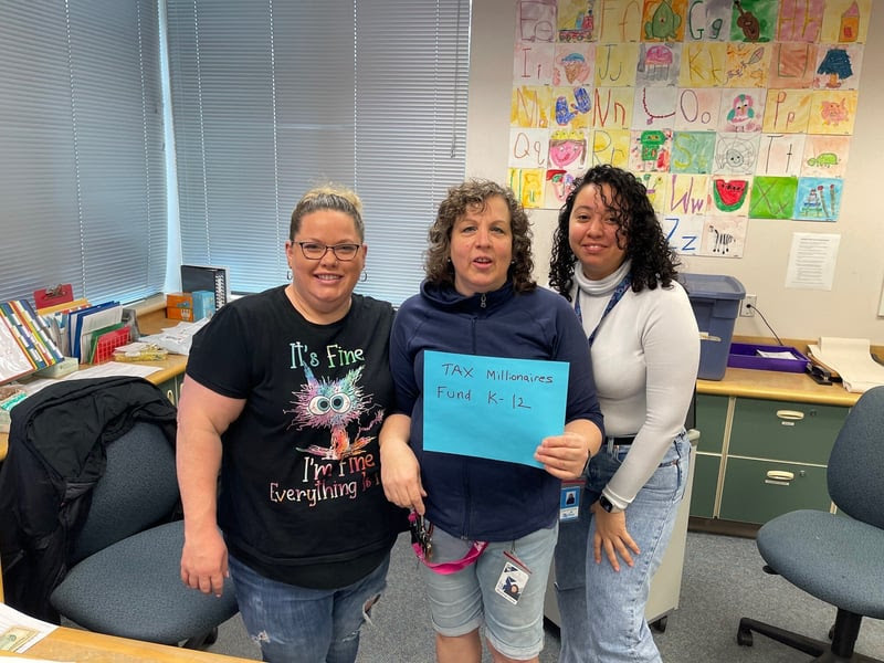 Take a selfie – like this one! – holding a sign in support of the Millionaires Tax – and tag us on social media! We’re on Instagram, Facebook, and Bluesky.