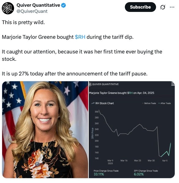 You’ve probably seen this by now, but members of Congress like Marjorie Taylor Greene seemed to have magically known when to buy stocks before Trump announced that he would be pausing his economy-wrecking tariffs for 90 days.