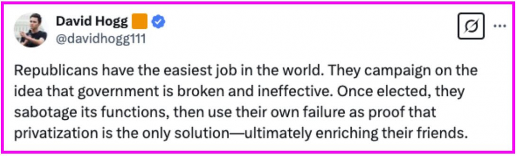The GOP intentionally makes government dysfunctional so they can justify selling it off to their wealthy donors. It’s not just bad policy — it’s a calculated scam.