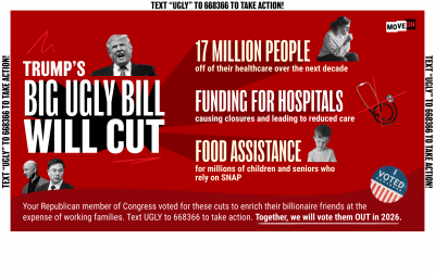 Contributions to MoveOn Civic Action are not tax-deductible for income tax purposes. MoveOn.org Civic Action – PO Box 96141, Washington, D.C. 20090-6141. ActBlue Civics Inc. is the merchant of record for all transactions made to MoveOn Civic Action using the ActBlue platform. ActBlue Civics Inc. receives and processes these donations before disbursing them to MoveOn Civic Action within 30 days of receipt.