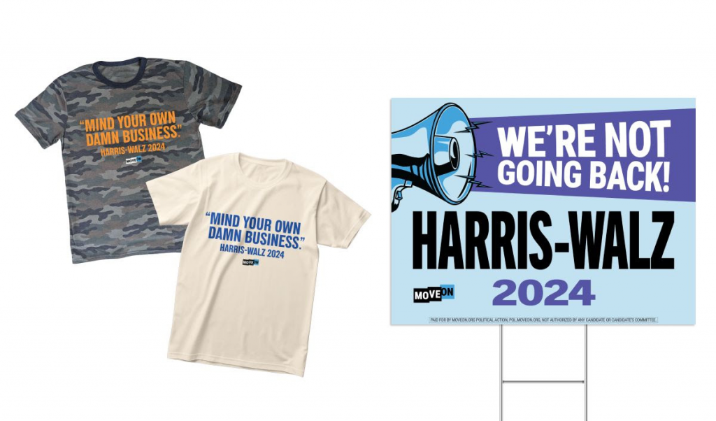To celebrate and continue to build momentum for her underdog campaign, MoveOn is releasing brand-new merchandise, including an awesome “We’re Not Going Back” Harris-Walz 2024 yard sign and a “Mind Your Own Damn Business” T-shirt.