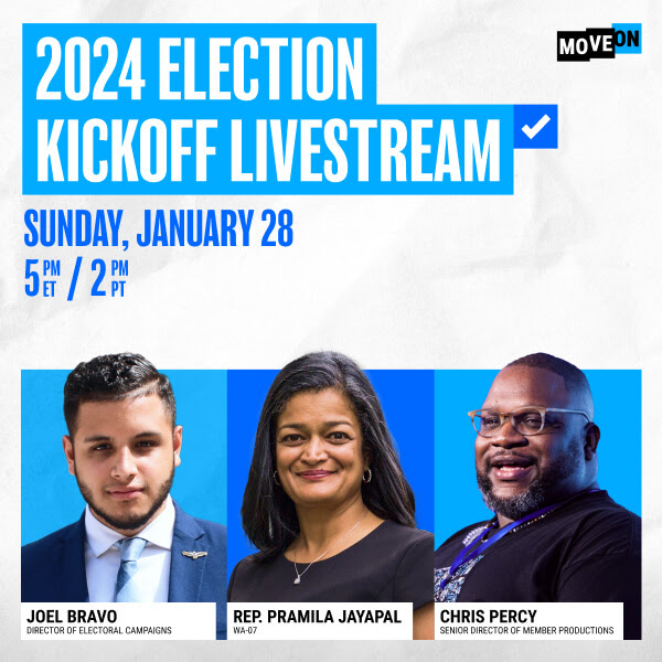Join the one-hour livestream with the MoveOn team and national progressive leaders, including Representative Pramila Jayapal, to cover the electoral landscape, which voters are likely to tip this election, and how MoveOn members can reach, persuade, and turn them out to vote. You’ll have the chance to become a MoveOn Vote Mobilizer or sign up for other active roles that will give you high-impact opportunities throughout 2024.