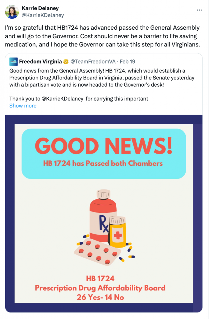 Congratulations to State Representative Karrie Delaney on the passage of your bill that would establish a Prescription Drug Affordability Board in Virginia!