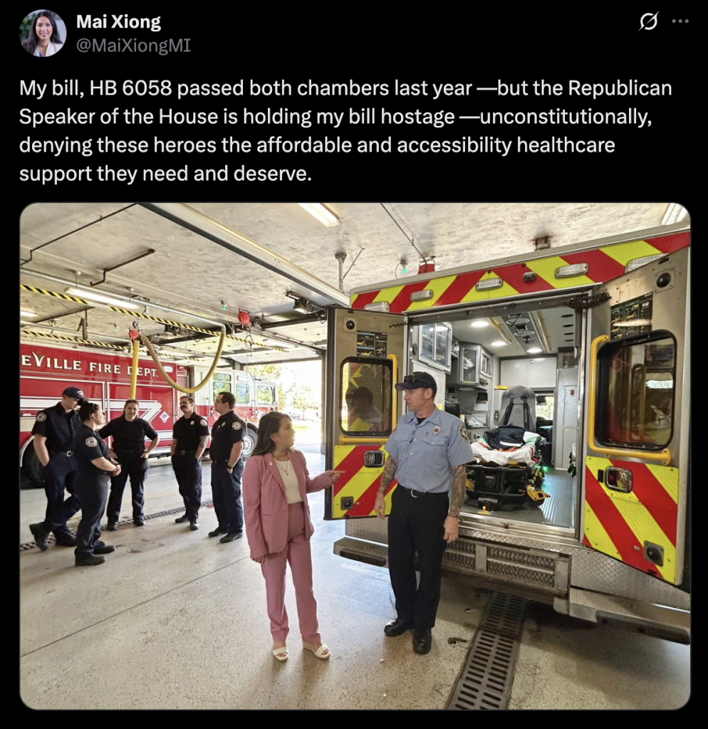 Rep. Mai Xiong, State Representative for Michigan’s 13th House District, is fighting to lower health insurance costs for firefighters. She’s looking to adopt legislation to address recruitment, retention and fully funding departments. Thank you for your advocacy!