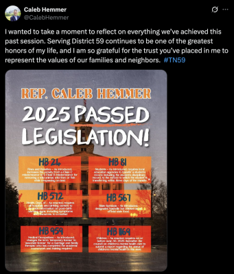 Congratulations Rep. Hemmer for a successful legislative season! Tennessee’s 59th district is lucky to have your leadership.