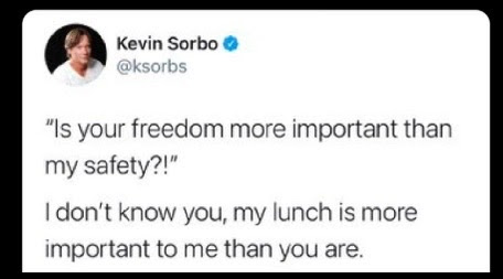 The Democrat’s message is about others. The Republican message is very much about the individual. It is personal. Very personal. There are other contrasts, but this one specifically is important, because in the words of Kevin Sorbo, B actor who played Hercules and MAGA mouthpiece, “Is your freedom more important than my safety? I do not know you. My lunch is more important to me than you are.”