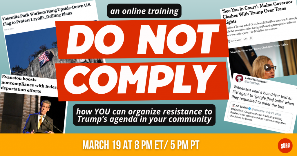 This is the second webinar in SURJ’s ongoing series, “Protect & Resist: First 100 Days Action and Training Program.” We are also hosting twice-monthly online action hours. You can join the other events here.