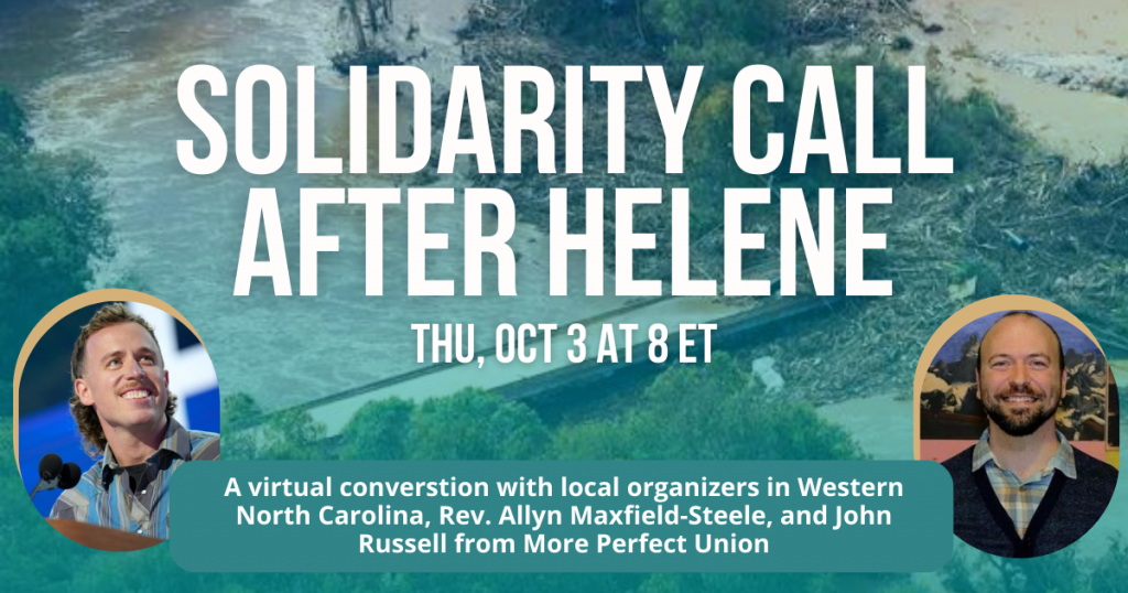 Join us tomorrow at 8 pm ET for a public solidarity call with communities affected by the storm. We will be in conversation with SURJ organizers on the ground in Western North Carolina, as well as Appalachian political commentator John Russell and Rev. Allyn Maxfield-Steele in Asheville.