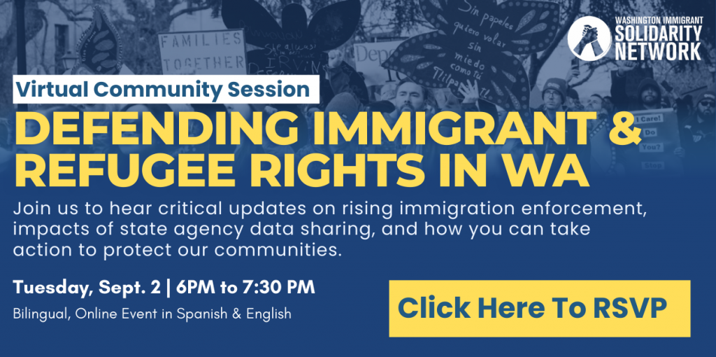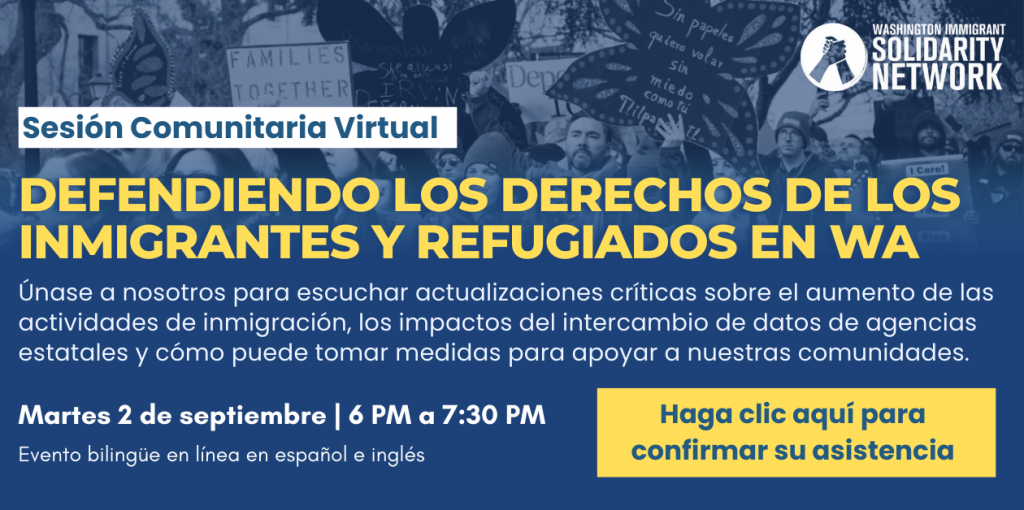 En esta sesión, compartiremos lo que nos informan las agencias del gobierno estatal y local, incluyendo información reciente sobre cómo nuestros datos personales están en riesgo. Habrá espacio para que puedan hacer preguntas y compartir sus inquietudes, y les informaremos sobre cómo WAISN y nuestros socios están respondiendo a las amenazas contra nuestras comunidades y cómo pueden unirse a nosotros en esta lucha por nuestros derechos.