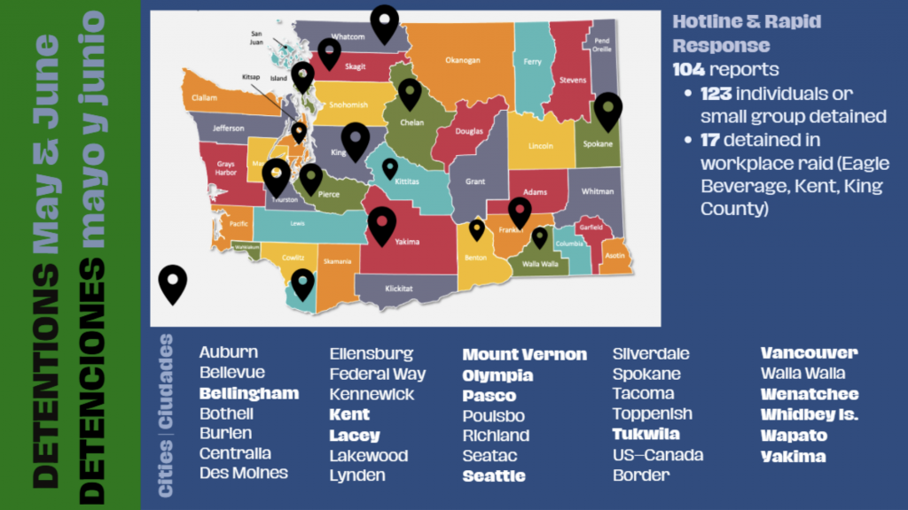 In May and June, we received reports of 140 detentions, which is more than the 131 we saw in the four months from January to April. This not only reflects an increase in enforcement activity, but the fact that we’re getting these reports from more locations across the state shows that we’re building community resilience: more people know the Hotline number and are reaching out to get support and take control of their situation.