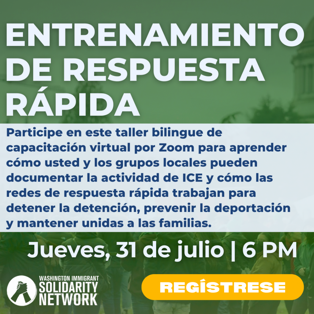 P.D. Si desea reportar actividad de inmigración, redadas y detenciones en Washington, por favor llame a la Línea de Defensa contra la Deportación de WAISN al 1-844-724-3737. Tenemos operadores disponibles de lunes a viernes de 6 am a 6 pm para atender su llamada. Nuestros operadores hablan español e inglés, y tenemos interpretación disponible en casi 300 idiomas.