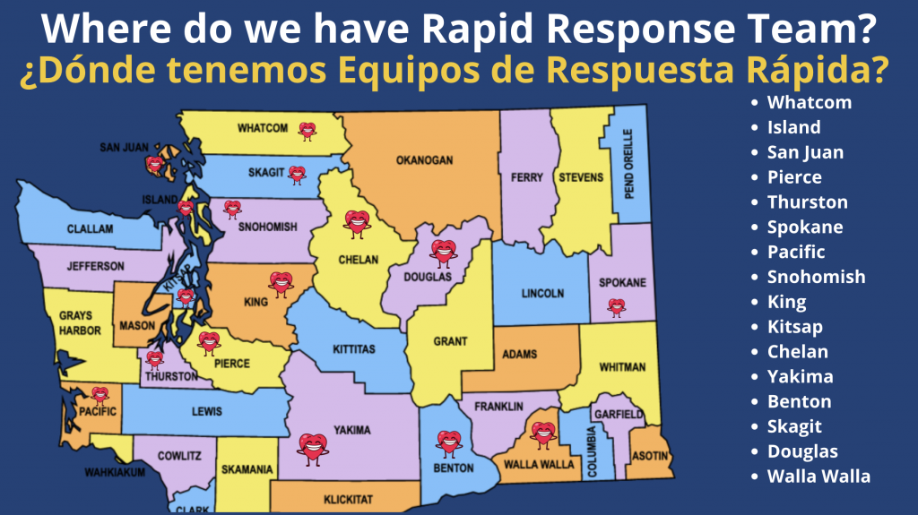 ¡Nuestros equipos de Respuesta Rápida siguen creciendo! Si se ha inscrito para formar parte de un equipo, tenga paciencia, tenemos una lista larga de personas. A continuación se muestran los condados donde tenemos un equipo