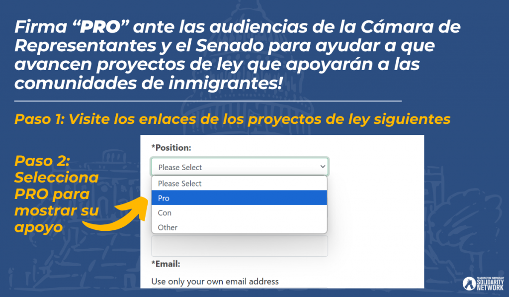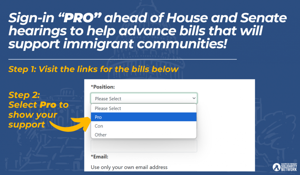 En este momento, las políticas clave que protegen a los inmigrantes y refugiados se están moviendo a través de la legislatura de Washington y necesitamos su ayuda para impulsarlas. Al firmar “PRO” en los proyectos de ley a más tardar una hora antes de sus audiencias, puede mostrar su apoyo para que estas políticas avancen fuera del comité. ¡Solo toma 2 minutos cada una!