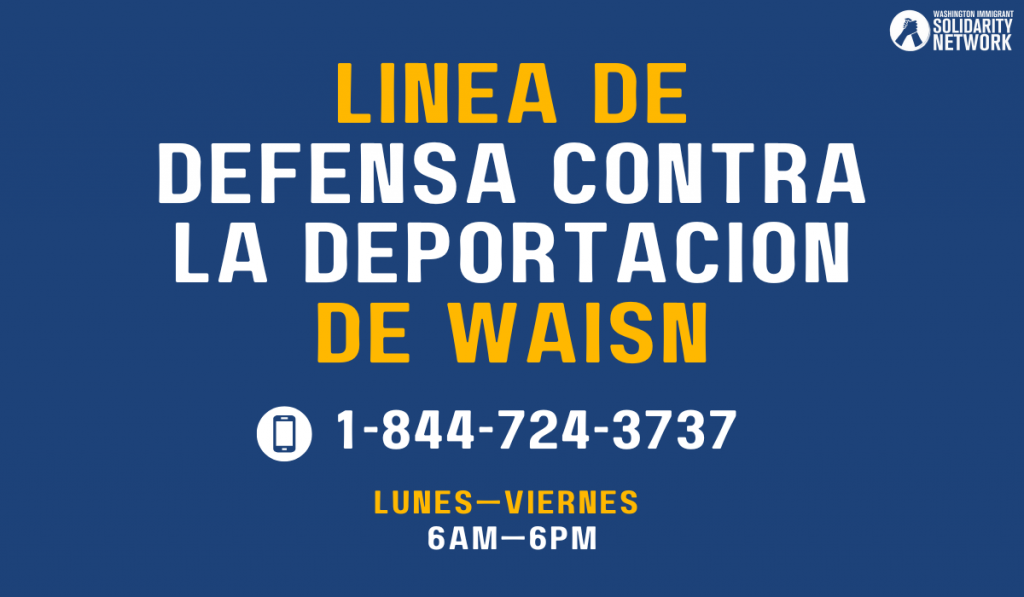 P.D. Si desea reportar actividad de inmigración, redadas y detenciones en Washington, por favor llame a la Línea de Defensa contra la Deportación de WAISN al 1-844-724-3737. Tenemos operadores disponibles de lunes a viernes de 6am a 6pm para atender su llamada. Nuestros operadores hablan español e inglés, y tenemos interpretación disponible en casi 300 idiomas.