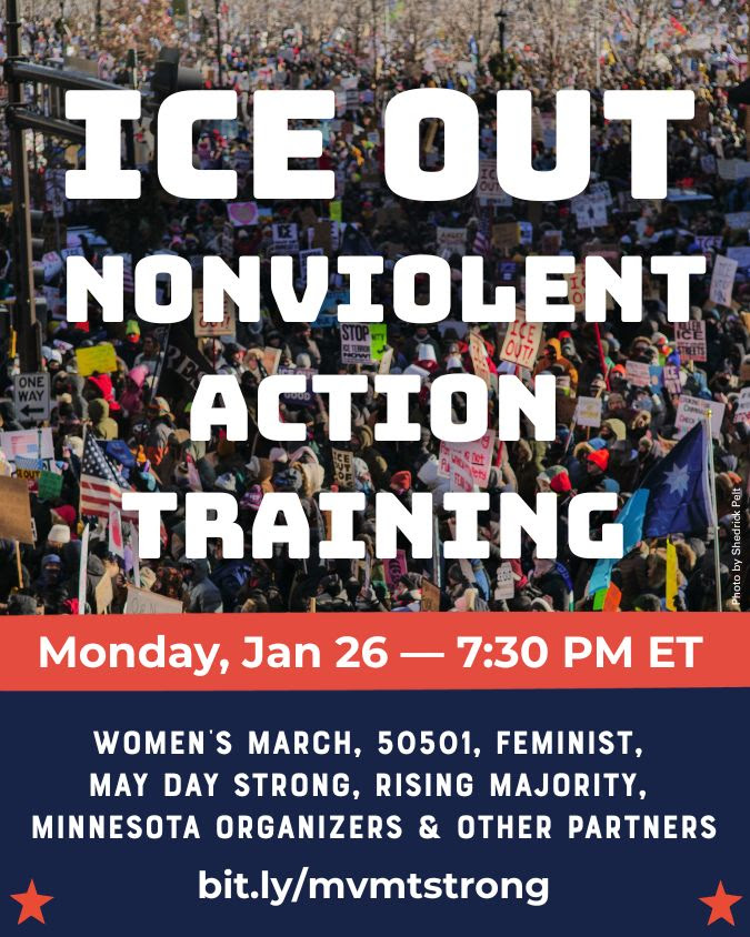 Tonight at 7:30pm ET, Women’s March, 50501, FEMINIST, May Day Strong, Rising Majority, Minnesota organizers, and partners are hosting an interactive, skills-based training focused on real, tangible action.