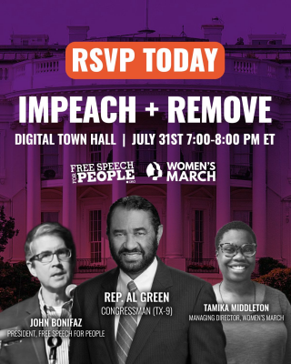 This was not the last impeachment vote, and it is up to us, the American people, to build a movement powerful enough to force Congress to impeach and remove Trump. Free Speech For People and Women’s March invite you to join us for this digital town hall to learn about the case for impeachment from Congressman Green and constitutional law experts, and learn how we can all take action to end this tyranny.