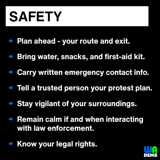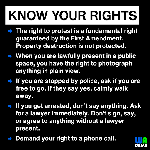 These provocations are meant to “justify” federalizing the Washington National Guard and stripping our state of its sovereignty. Trump wants violence so he can send in troops. Please use the following resources to be safe, cautious, and mindful as you exercise your First Amendment rights.