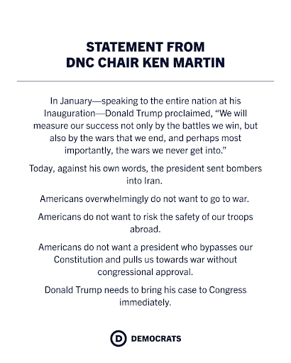 I wanted to share this statement DNC Chair Ken Martin released when it was reported that the Trump administration had committed an act of war against Iran without congressional support or approval: