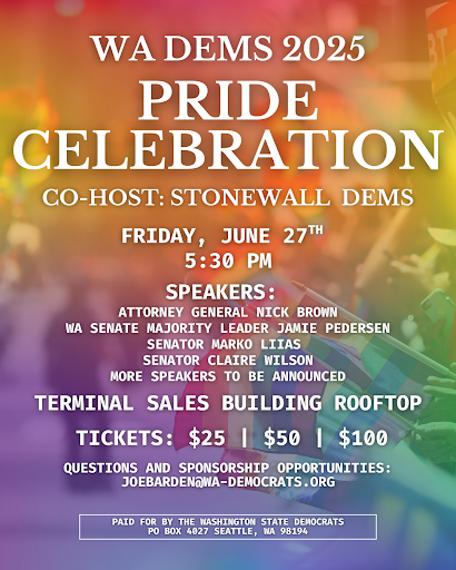 TODAY: Washington Democrats and Stonewall Democrats are co-hosting a 2025 Pride Happy Hour on our rooftop deck with gorgeous views of Puget Sound the Friday before Seattle Pride Weekend. I’m thrilled to announce that DNC Vice Chair Malcolm Kenyatta will attend as our special guest. Celebrate with members of the LGBTQIA+ caucus like Senate Majority Leader Jamie Pedersen and Senators Claire Wilson and Marko Liias as well as Attorney General Nick Brown and Washington’s first openly gay statewide executive Commissioner of Public Lands Dave Upthegrove! Come join us for a brief speaking program followed by light appetizers and raise a glass to toast a happy Pride! RSVP Here.