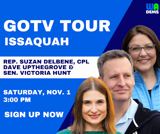 - SATURDAY, 11/1 – Canvass for Senator Victoria Hunt w/ the WA Dems, Congresswoman Kim Schrier, and more in Issaquah at 3 PM. Sign up HERE.
